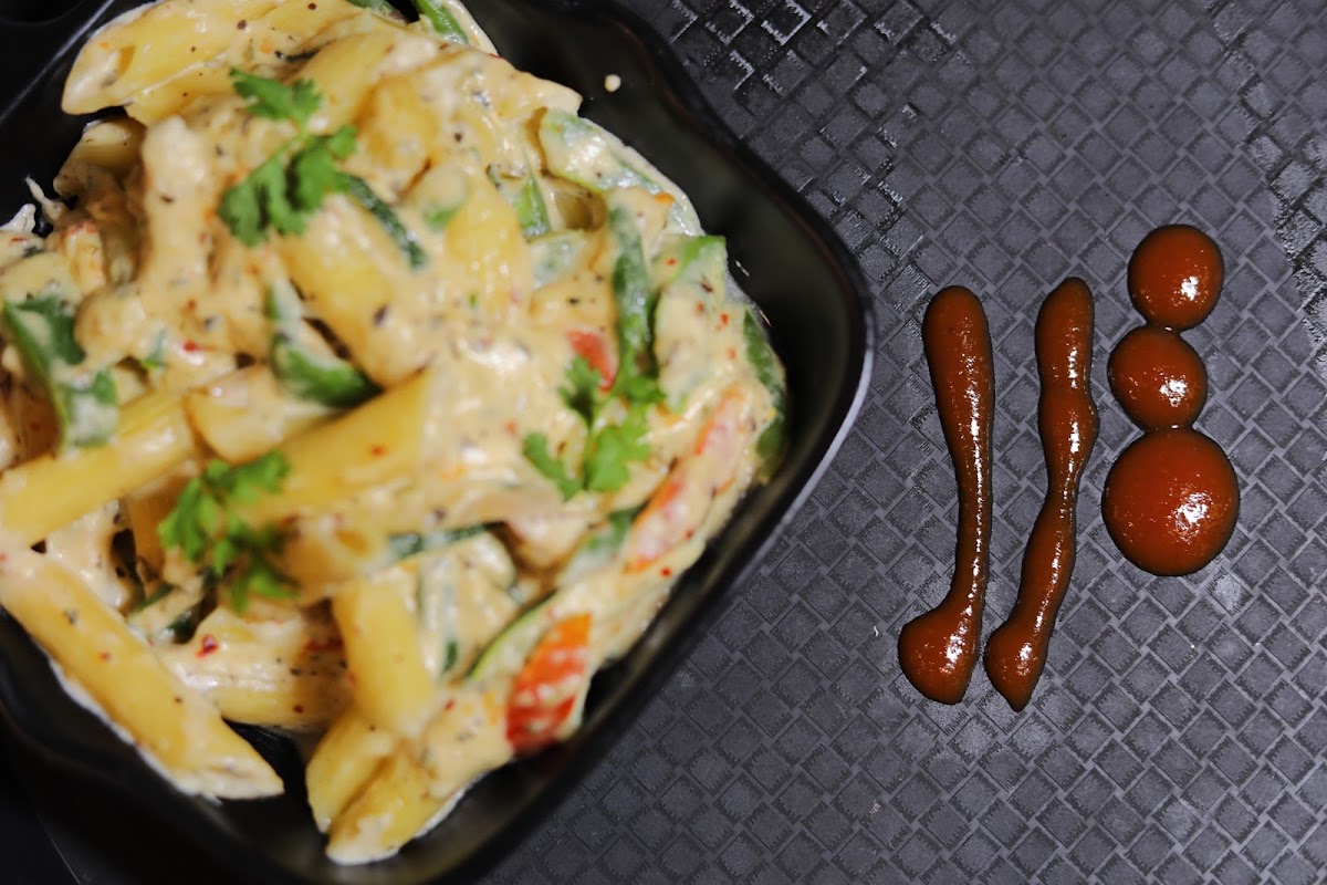 [Veg preparation] Delicious penne pasta tossed in our signature blend of mix creamy sauce and exotic veggies to make your taste buds to cloud nine.