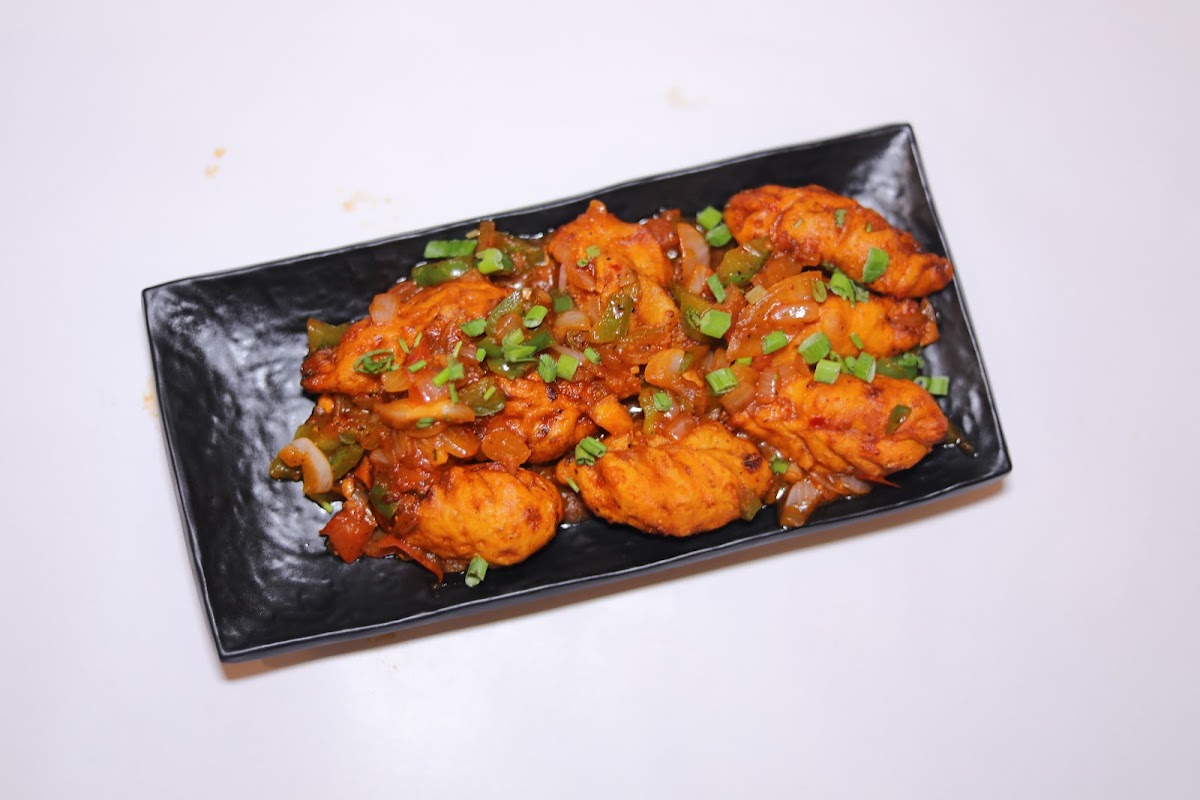 A veg dish where soya chaap [a type of soya protein] is cooked in a spicy chili sauce, often with onions and bell peppers, creating a flavorful and satisfying meal.